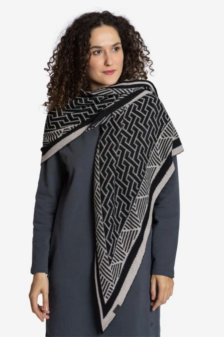 Der Dreiecksschal BERMUDA begeistert durch sein zweifarbiges, grafisches Strickdesign und die Vielfältigkeit der Möglichkeiten. Als Schal, als Tuch, als Kopftuch getragen, bei einer Größe von 180×80 cm ist einfach alles möglich. Das Strick-Accessoire wird in einem Familienbetrieb vor den Toren Lüneburgs fair produziert und wertet jedes Herbst- und Winter-Outfit gekonnt auf.